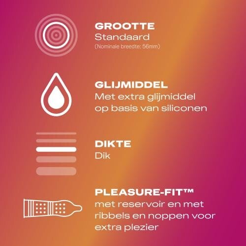 Durex Pleasure Me Condooms zorgen voor maximale stimulatie voor jou en je partner. De speciale pasvorm met uniek geplaatste ribbels en verhoogde nopjes bieden een extra intens gevoel voor zowel jou als je partner. De ribbels bevinden zich onderaan het condoom, voor maximale stimulatie van de clitoris. Daarnaast zorgt de extra bolle vorm voor extra frictie en meer stimulatie! In principe is ieder getest condoom geschikt voor vaginaal, oraal en anaal contact, mits de pasvorm goed is en er voldoende glijmiddel gebruikt wordt.