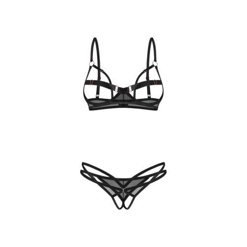 Laat je eigenzinnige en krachtige kant spreken met deze tweedelige set die speciaal is ontworpen voor wie geen concessies wil doen. Het ontwerp combineert een open bh en een uitgesneden string die samen een moderne, opvallende en zelfbewuste uitstraling creëren. De bandjes rond de buste vormen een intrigerend lijnenspel, waardoor de vormen subtiel worden omlijst en extra accent krijgen. Dankzij de beugelondersteuning blijft de bh stevig en comfortabel zitten, terwijl het open design zorgt voor een spannende en speelse look.